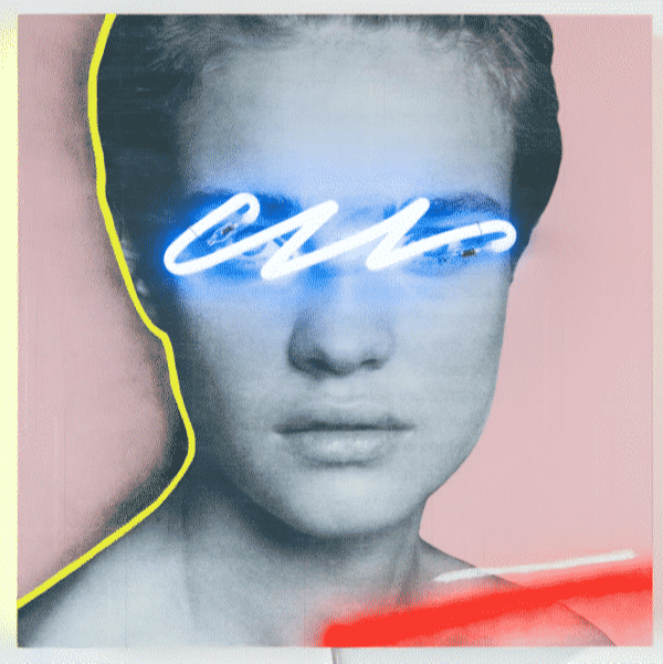 Acrylic, collage, and neon light on wood